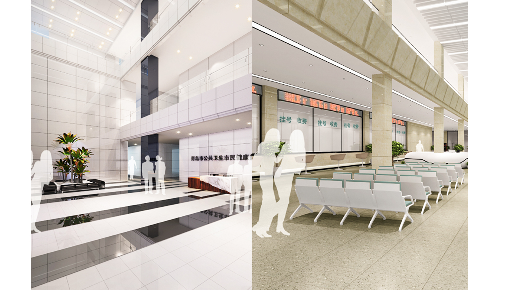 結(jié)合周邊的環(huán)境和節(jié)省造價(jià)的因素綜合考慮,建筑立面為干凈簡(jiǎn)潔的現(xiàn)代風(fēng)格,臨床中心以橫向線條為主,公共衛(wèi)生中心以豎線條為主,市民健康體驗(yàn)中心強(qiáng)調(diào)建筑的標(biāo)志性;建筑平面主要解決不同功能的區(qū)域劃分和避免流線交叉的問(wèn)題。