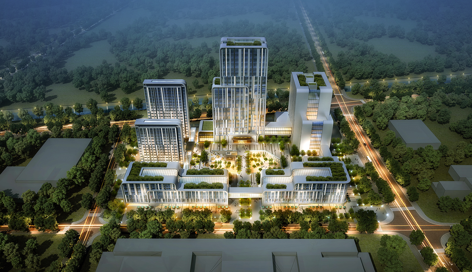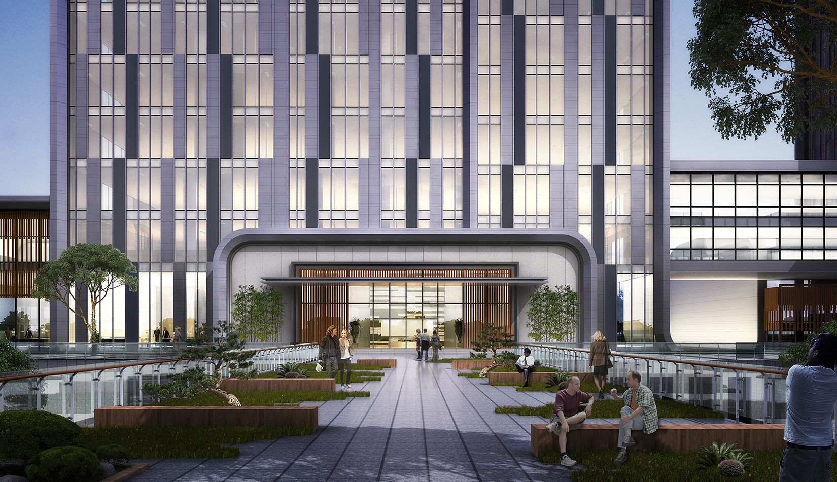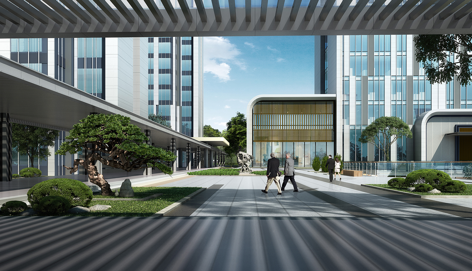 建筑圍合共享的中間庭院,庭院采用新中式風格,屋頂設計屋頂花園,靜謐淡雅,為人們提供一個安靜休憩空間。