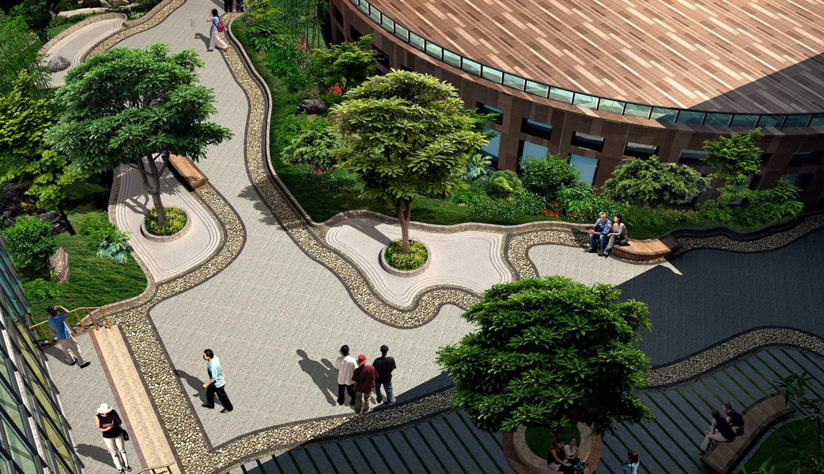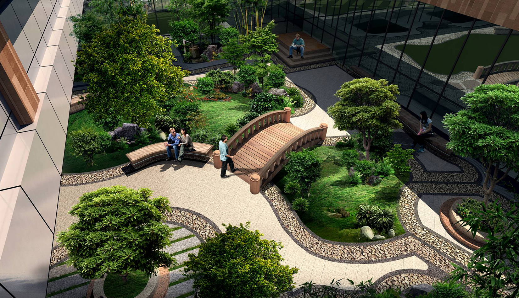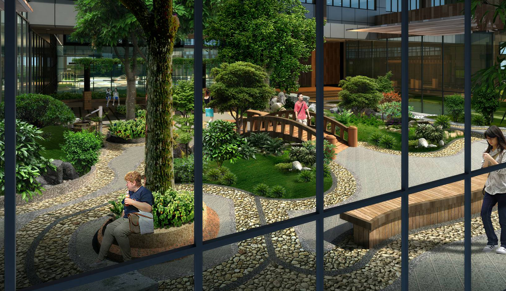2. 綜合服務樓中心設計特色水景一處,潺潺的流水聲,增加整個入口空間的活潑歡快的氣氛。