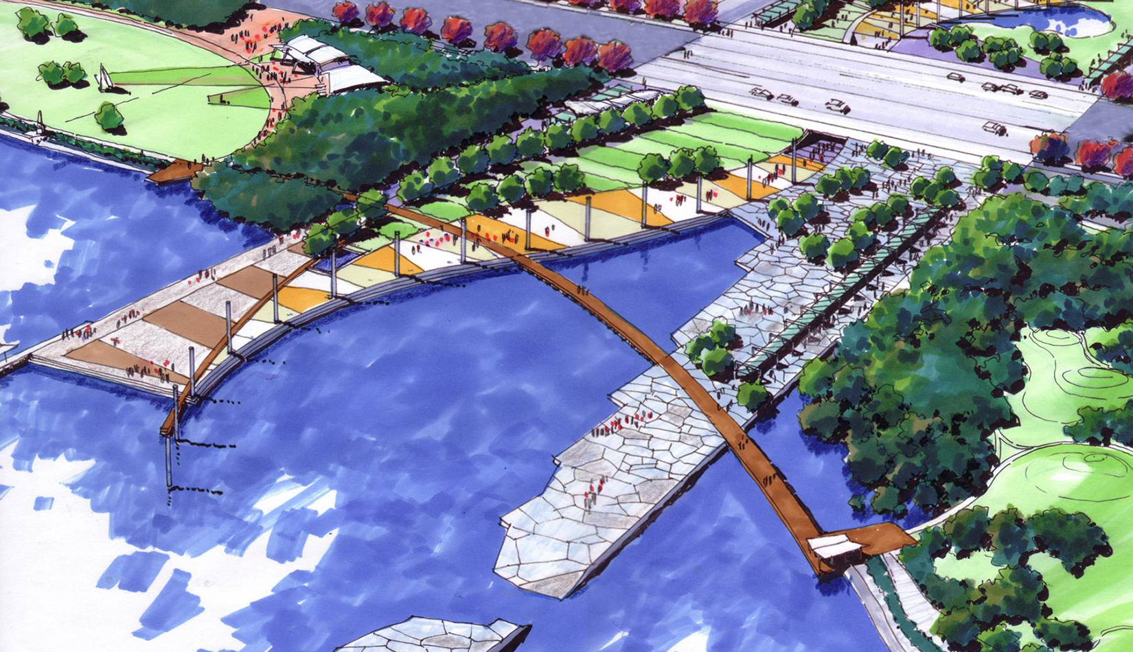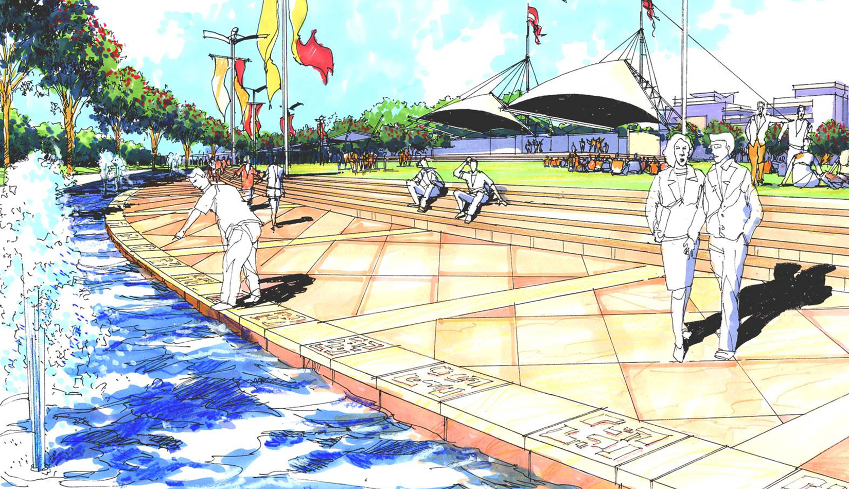 本著“文化著陸于自然”、“邊界突出聯(lián)系”的設(shè)計(jì)理念,規(guī)劃將灣島全線自西向東分為濱海運(yùn)動(dòng)休閑、親水廣場(chǎng)、公共藝術(shù)公園、人與自然公園和碼頭休閑娛樂(lè)5 個(gè)景區(qū),為基地北側(cè)的城市功能區(qū)乃至黃島區(qū)提供了一片高品質(zhì)的、現(xiàn)代濱海城市休閑景觀帶,增強(qiáng)區(qū)域的軟環(huán)境競(jìng)實(shí)力。