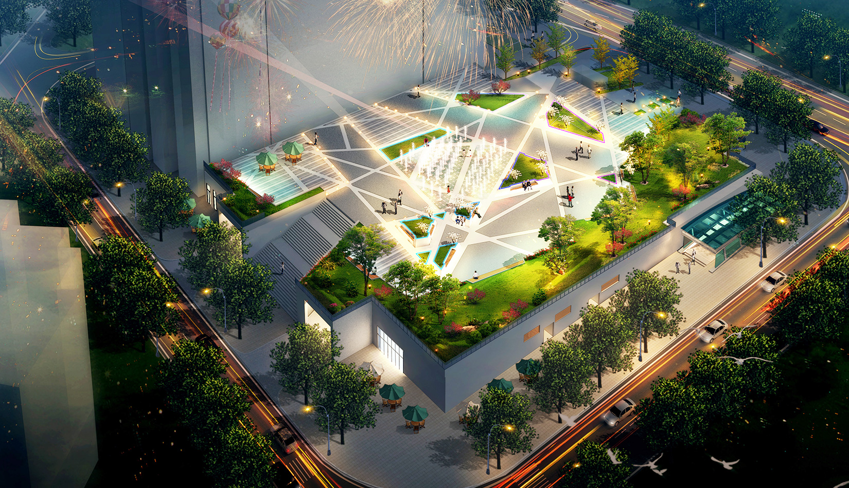 結(jié)合臺(tái)東商圈地理位置,在建筑南側(cè)設(shè)臨街廣場(chǎng),考慮視線的通透與遮擋,與帶狀綠地自然的溝通,達(dá)到廣場(chǎng)、建筑、景觀的完美結(jié)合。
