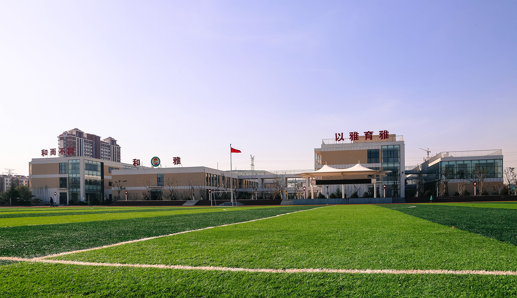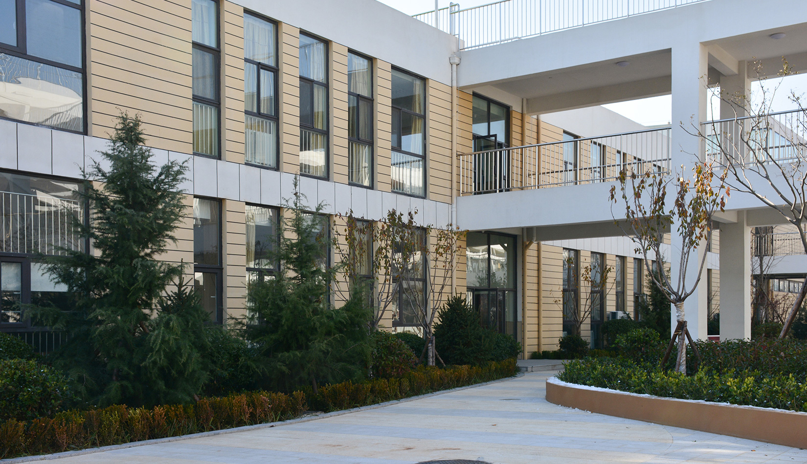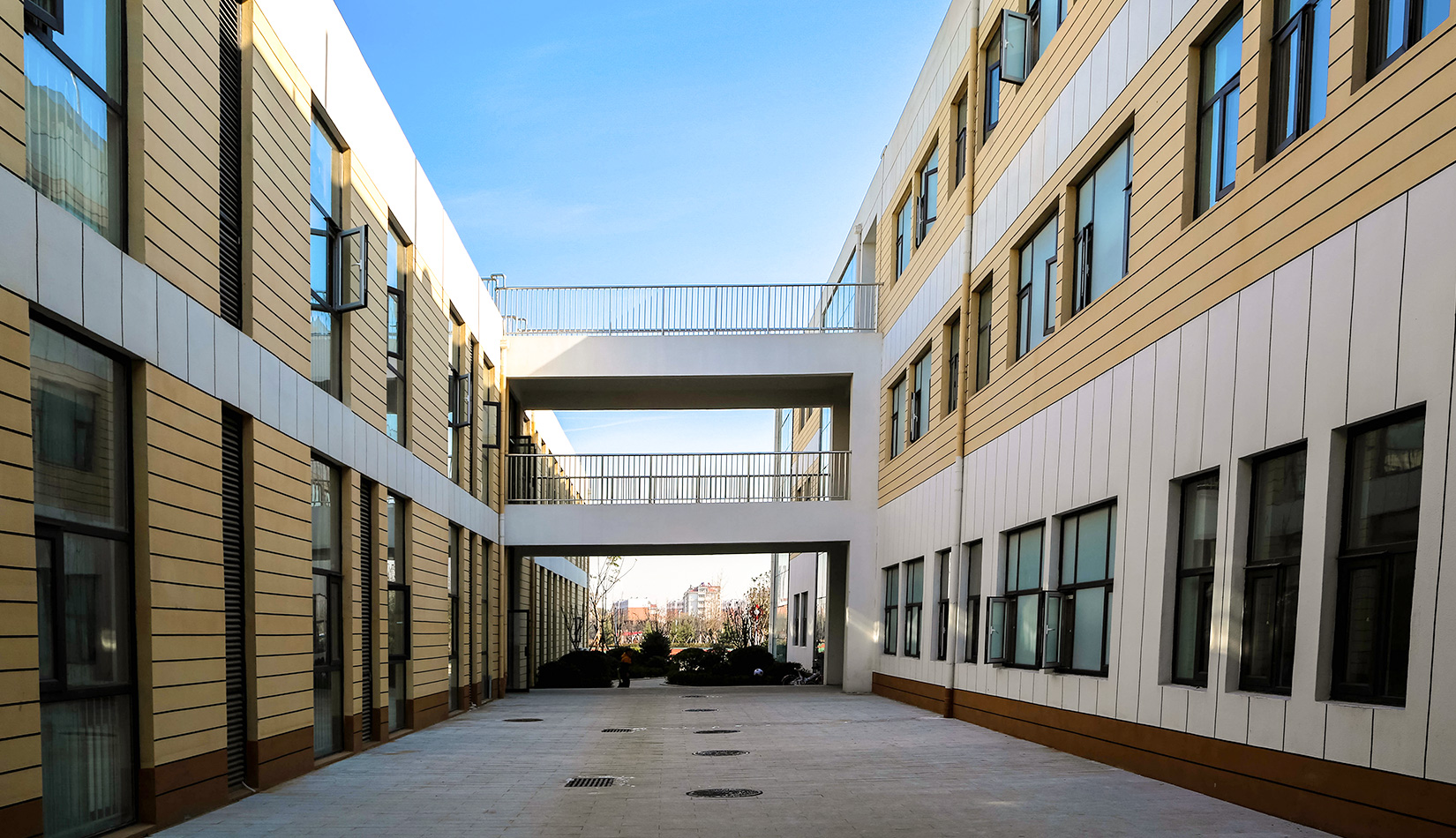 該項目通過幾個建筑單體與架空走廊的穿插連接將整個校區(qū)有機(jī)聯(lián)系起來,實現(xiàn)了建筑功能的整體性,完善了建筑可達(dá)性。形成的中庭空間可成為交流為主的平臺,營造了學(xué)習(xí)、活動為一體的校園氛圍。建筑外立面以簡潔的現(xiàn)代風(fēng)格為主,同時表現(xiàn)校園文化,主要采用黃色與白色真石漆形成色彩對比,在教室南立面、樓梯間、就餐區(qū)等采用整體通透的玻璃幕墻與實墻形成虛實對比,形成簡潔而不失活潑的建筑風(fēng)格。利用借景等手法進(jìn)行室外綠化設(shè)計,整體打造一個高品質(zhì)的學(xué)校環(huán)境。