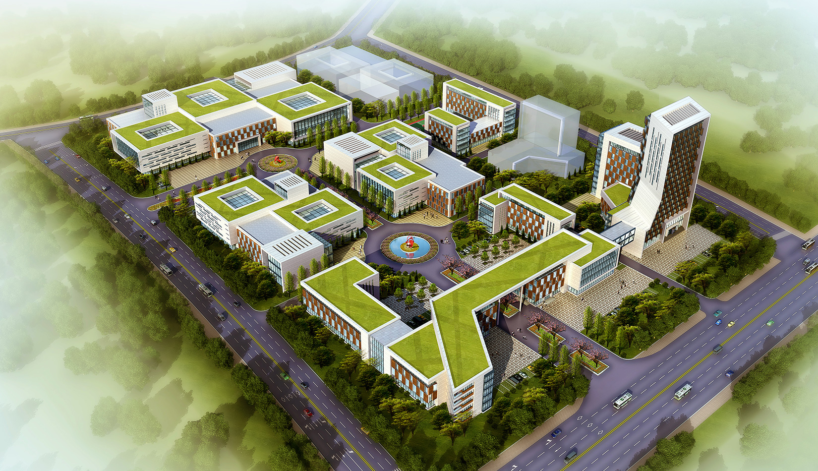 設計中著重實現(xiàn)“產(chǎn)業(yè)有核體”理念。依據(jù)功能不同,各自以庭院、廣場的形式形成獨立核心。以類似“綜合體”的形式實現(xiàn)各自功能分區(qū)的獨立完整。兩大功能核心體主軸線體系為基礎進行串聯(lián),在保證相互間直達性的同時又互不干擾。