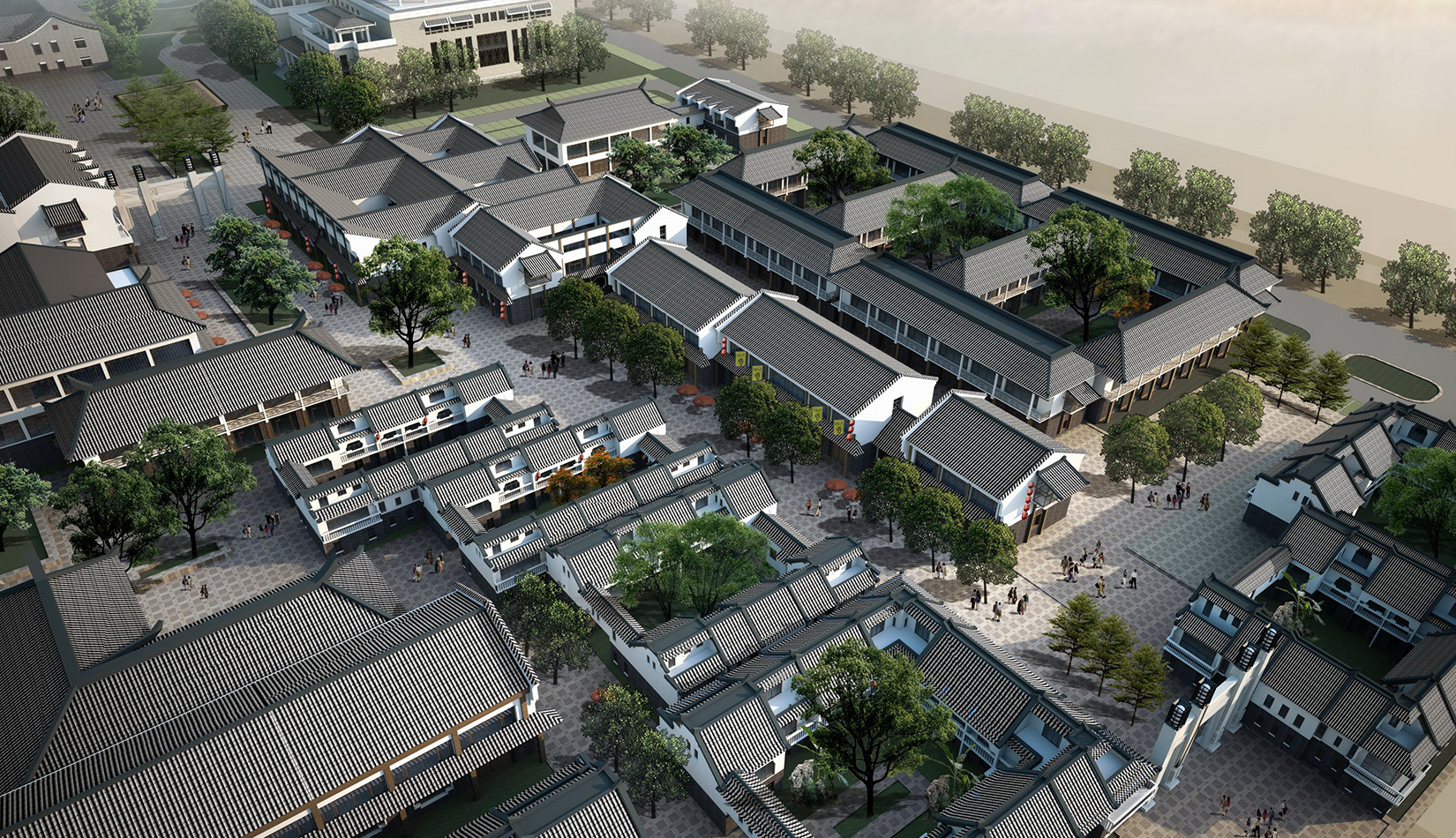 在構(gòu)思和總體布局上引入“潛龍情節(jié)”。結(jié)合用地南北狹長(zhǎng)、北面臨海的地形特征和自由靈活的建筑布局,將中華民族的文化象征——龍圖騰與傳統(tǒng)文化的燦爛之花——書(shū)畫(huà)藝術(shù)相結(jié)合,將主要軸線以龍為形,寓意著書(shū)畫(huà)藝術(shù)的振興和華夏文化的騰飛。