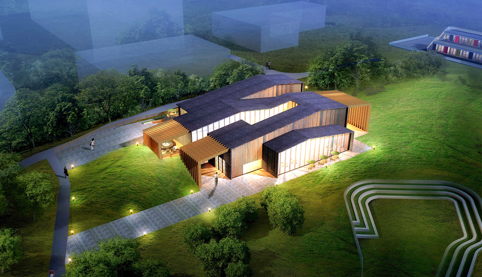 項目選址位于“中德創(chuàng)意設計 D-ZONE”地塊中,天然的谷地和水流,以草地為主。 考慮到周邊建筑及環(huán)境,確定了交錯的疊合的取景形式,致力于增加觀景表面積將美景框入窗中。 辦公區(qū)、多功能廳、展覽區(qū)、室外展廳和自然環(huán)境相互交融并置,相互之間流線獨立又彼此滲透。